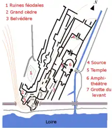 - la troisième étape (postérieure au décès de Marie-Louise) est l'aménagement du flanc amont du promontoire ; il s'agit d'une zone moins abrupte, mais beaucoup plus vaste qui doit relier le manoir à la Loire[B 5] ; selon Jean-Gabriel Bouchaud, il s'agit de créer un palais en plein air en vue de fêtes futures, notamment celle du 18e anniversaire de Jeanne-Louise (à l'été 1829). Malheureusement, en 1829, Jeanne-Louise n'est pas bien portante et aucune fête n'a lieu[15], puis elle meurt au début de 1830, rendant tout ce travail vain aux yeux de son père.