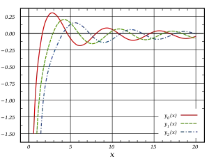 Les trois premières fonctions de Bessel sphérique de deuxième espèce yn(x)