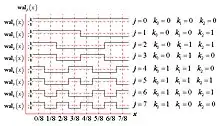 pour un entier m avec les ki égaux à 0 ou 1. Ensuite, si k est le résultat en code Gray de j – 1, alors la j-ième fonction de Walsh au point x, avec 0 ≤ x < 1, est :