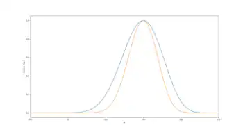 Enfin, on peut comparer les courbes (relatives) des vraisemblances dans le cas ci-dessus (en bleu), et dans le cas ou l'on fait deux fois plus d'observations (avec le même rapport entre pile et face), ici 24 pile et 16 face (en orange).