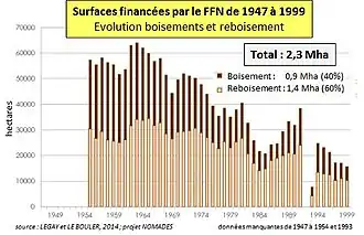 La surface boisée et reboisée a atteint au cours des 52 années de mise en œuvre du FFN un total 2 257 000 hectares (arrondi à 2,3 millions d’ha), soit une moyenne annuelle d’environ 44 000 ha. Cependant l’évolution en surface met en évidence une phase stationnaire de pleine activité du FFN de 1949 à 1967 où 55 000 hectares sont boisés ou reboisés chaque année, puis de 1967 à 1999 une décroissance continue et régulière, avec cependant quelques creux : en 1968 (dû aux événements de qui frappent le pays et déstabilisent l’Etat), en 1983 et 1993 (sûrement en conséquence d’une crise de la filière-bois).