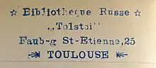 Le registre des délibérations de la Société russe de Toulouse fait état de la création d'une bibliothèque de lecture en 1910 sous le nom de "Bibliothèque Tolstoï". Elle siège à Toulouse dans le quartier Saint-Étienne et ouvre plusieurs soirs par semaine. L'usage de cette bibliothèque associative est réservé aux membres qui s'acquittent d'une cotisation mensuelle.