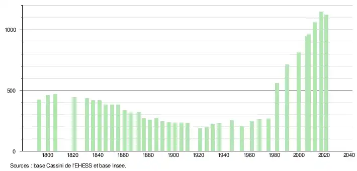 L'évolution du nombre d'habitants est connue à travers les recensements de la population effectués dans la commune depuis 1793. Pour les communes de moins de 10 000 habitants, une enquête de recensement portant sur toute la population est réalisée tous les cinq ans, les populations légales des années intermédiaires étant quant à elles estimées par interpolation ou extrapolation[20]. Pour la commune, le premier recensement exhaustif entrant dans le cadre du nouveau dispositif a été réalisé en 2007[21].