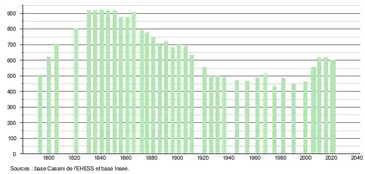 L'évolution du nombre d'habitants est connue à travers les recensements de la population effectués dans la commune depuis 1793. Pour les communes de moins de 10 000 habitants, une enquête de recensement portant sur toute la population est réalisée tous les cinq ans, les populations légales des années intermédiaires étant quant à elles estimées par interpolation ou extrapolation[15]. Pour la commune, le premier recensement exhaustif entrant dans le cadre du nouveau dispositif a été réalisé en 2005[16].