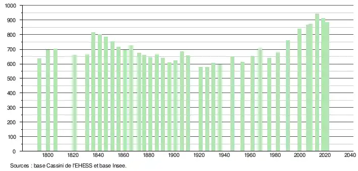 L'évolution du nombre d'habitants est connue à travers les recensements de la population effectués dans la commune depuis 1793. Pour les communes de moins de 10 000 habitants, une enquête de recensement portant sur toute la population est réalisée tous les cinq ans, les populations légales des années intermédiaires étant quant à elles estimées par interpolation ou extrapolation[20]. Pour la commune, le premier recensement exhaustif entrant dans le cadre du nouveau dispositif a été réalisé en 2008[21].