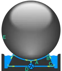 La pompe (D) crée un film d'eau sous pression empêchant la boule d'entrer en contact avec le socle.