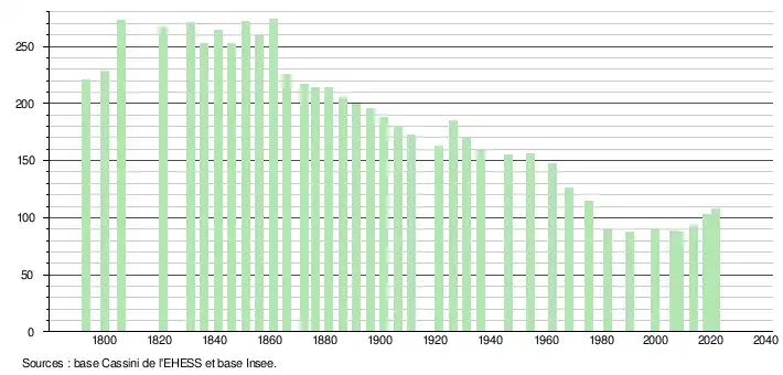 L'évolution du nombre d'habitants est connue à travers les recensements de la population effectués dans la commune depuis 1793. Pour les communes de moins de 10 000 habitants, une enquête de recensement portant sur toute la population est réalisée tous les cinq ans, les populations légales des années intermédiaires étant quant à elles estimées par interpolation ou extrapolation[43]. Pour la commune, le premier recensement exhaustif entrant dans le cadre du nouveau dispositif a été réalisé en 2008[44].