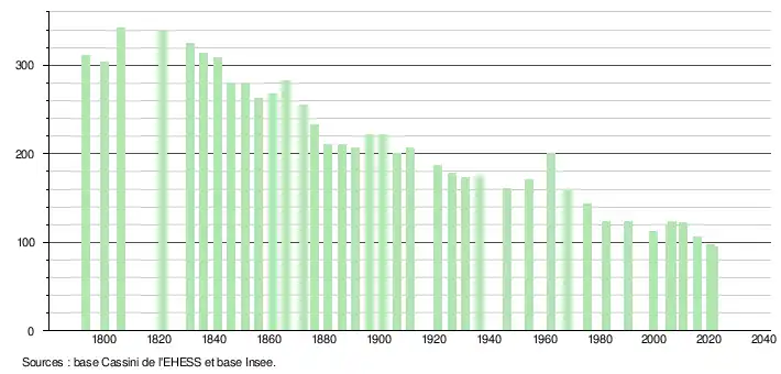 L'évolution du nombre d'habitants est connue à travers les recensements de la population effectués dans la commune depuis 1793. Pour les communes de moins de 10 000 habitants, une enquête de recensement portant sur toute la population est réalisée tous les cinq ans, les populations légales des années intermédiaires étant quant à elles estimées par interpolation ou extrapolation[39]. Pour la commune, le premier recensement exhaustif entrant dans le cadre du nouveau dispositif a été réalisé en 2005[40].