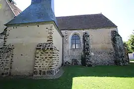 - Eglise Saint-Aignan, inscrite au titre des Monuments historiques en 1953[28], date du XVe siècle. Certaines baies ont conservé des fragments de vitraux du XVIe siècle. Dans la chapelle latérale nord se trouve notamment un arbre de Jessé du premier quart du XVIe siècle, tandis que dans la chapelle sud, de la même époque, est visible un saint Jean-Baptiste portant l'agneau pascal[29]. Quatre verrières de l'édifice sont ainsi classées monument historique au titre d'objet, partiellement (baies 4 à 6, 8)[30]. Outre ces vitraux, l'élément le plus remarquable de cet édifice est, à l'intérieur, le retable encadré des statues de saint Aignan et saint Sébastien, qui se détachent sur un fond de boiserie sculptée de volutes et de motifs végétaux, dans un style rococo.