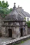 Fontaine monumentale de plan carré renforcée de contreforts diagonaux sur les angles, ajourée sur trois côtés de baies en anse de panier. La fontaine est couverte d'une voûte de pierre à extrados caréné, sommé d'une croix sur base fleuronnée (rapportée). Construction en grand et moyen appareil de granite et moellons de schiste. Le mur de fond présente deux niches à statuette (vide). De nombreuses traditions lui sont rattachées : les amoureux y jetaient une épingle qui attachant le fichu de leur bien-aimé ; si elle surnageait, l'amoureux était sûr de l'innocence de sa belle. La fontaine était aussi consultée par les maris jaloux ou encore par les victimes d'un vol : celles-ci devaient s'y rendre à jeun et jeter des croûtons dans la fontaine en donnant à chacun le nom d'une personne soupçonnée ; celui qui restait au fond désignait le coupable ; cette façon de procéder était encore attestée en 1832[1],[2].