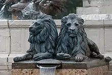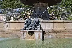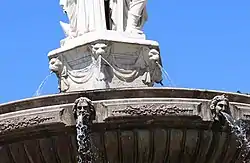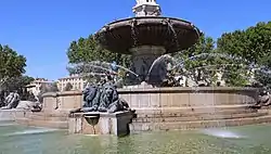 Une chaîne, coulée maillon par maillon au centre aixois d'Arts et Métiers ParisTech entoure le monument. Six groupes de deux lions sont disposés sur des socles en marbre du Tholonet, pour rappeler l’origine de l’eau, au bord du bassin circulaire de 32 mètres de diamètre. À l'intérieur de ce bassin, quatre groupes d'enfants montent des cygnes de fonte bronzée coulés dans les usines Muel Wahl et Compagnie de Tusey (près de Vaucouleurs - Meuse ). Le bassin principal est surmonté d'un autre bassin, plus petit, de 15 mètres de diamètre. La vasque, de 8 mètres de diamètre, a été fondue dans les ateliers Berthet, à Aix-en-Provence[6]. Le piédestal qui surmonte la vasque a été réalisée par François Truphème (1820-1888)[6], que d'aucuns jugent déplaisant à la vue[10].