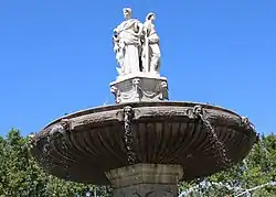 Trois statues de marbre, réalisées chacune par un sculpteur différent, ornent son sommet. Chacune a une signification particulière et regarde vers une voie. La sculpture qui regarde vers le cours Mirabeau a été réalisée par l'Aixois Joseph Marius Ramus (1805-1888). Elle symbolise la justice. La statue qui regarde la route de Marseille (avenue des Belges), œuvre de Louis-Félix Chabaud (1824-1902), sculpteur de Venelles, symbolise le commerce et l'agriculture. Enfin, la troisième, orientée vers la route d'Avignon (avenue Napoléon-Bonaparte), a été sculptée par Hippolyte Ferrat (1822-1882) et symbolise les beaux-arts.