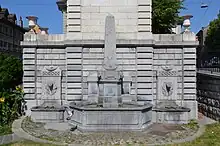 Cette fontaine monumentale, originellement à trois bassins (dont celui du centre, principal, était dominé par un obélisque), a été dessinée entre 1780 et 1786 par l’architecte français Pierre-Adrien Pâris pour figurer dans les Tableaux topographiques de la Suisse, du baron Zurlauben[1]. Le monument frappe alors par sa modernité et par son décor « dans le goût égyptien composé par le Sieur Brandoin l’Anglois »[2].