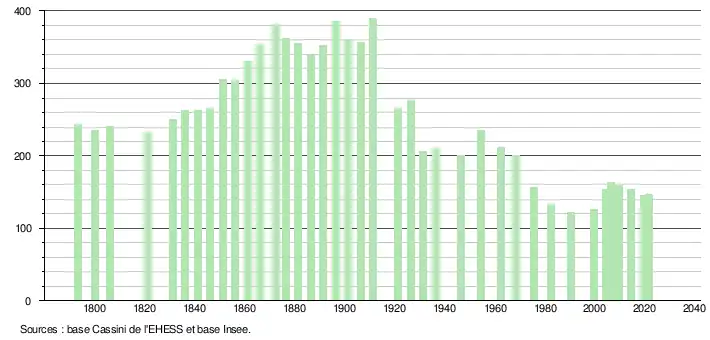 L'évolution du nombre d'habitants est connue à travers les recensements de la population effectués dans la commune depuis 1793. Pour les communes de moins de 10 000 habitants, une enquête de recensement portant sur toute la population est réalisée tous les cinq ans, les populations légales des années intermédiaires étant quant à elles estimées par interpolation ou extrapolation[14]. Pour la commune, le premier recensement exhaustif entrant dans le cadre du nouveau dispositif a été réalisé en 2004[15].