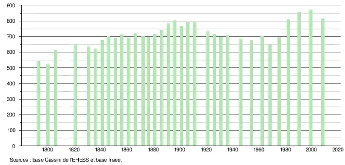 L'évolution du nombre d'habitants est connue à travers les recensements de la population effectués dans la commune depuis 1793. À partir du , les populations légales des communes sont publiées annuellement dans le cadre d'un recensement qui repose désormais sur une collecte d'information annuelle, concernant successivement tous les territoires communaux au cours d'une période de cinq ans. Pour les communes de moins de 10 000 habitants, une enquête de recensement portant sur toute la population est réalisée tous les cinq ans, les populations légales des années intermédiaires étant quant à elles estimées par interpolation ou extrapolation[11]. Pour la commune, le premier recensement exhaustif entrant dans le cadre du nouveau dispositif a été réalisé en 2008[12],[Note 1].