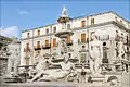 Le 26 mai 1574, la fontaine arrive à Palerme. Pour son transport, la fontaine est démontée en 644 pièces. Afin de lui faire de la place, plusieurs bâtiments sont démolis. Toutefois, la fontaine, à son arrivée à Palerme, est incomplète. Certaines sculptures sont endommagées pendant le trajet, d'autres sont peut-être conservées par Luigi de Toledo (probablement les statues de deux Divinités conservées au musée Bargello de Florence et d'autres statues placées à Naples, puis dans le jardin d'Abadia, dans la ville espagnole de Cáceres).