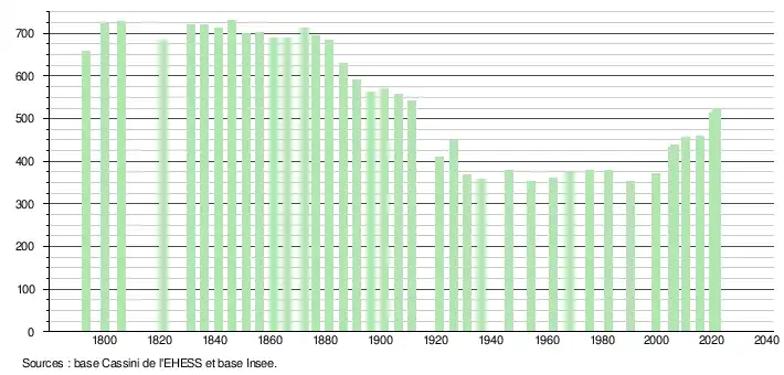 L'évolution du nombre d'habitants est connue à travers les recensements de la population effectués dans la commune depuis 1793. Pour les communes de moins de 10 000 habitants, une enquête de recensement portant sur toute la population est réalisée tous les cinq ans, les populations légales des années intermédiaires étant quant à elles estimées par interpolation ou extrapolation[34]. Pour la commune, le premier recensement exhaustif entrant dans le cadre du nouveau dispositif a été réalisé en 2005[35].