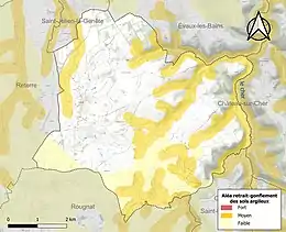 Le retrait-gonflement des sols argileux est susceptible d'engendrer des dommages importants aux bâtiments en cas d’alternance de périodes de sécheresse et de pluie. 30,6 % de la superficie communale est en aléa moyen ou fort (33,6 % au niveau départemental et 48,5 % au niveau national). Sur les 186 bâtiments dénombrés sur la commune en 2019, 14 sont en aléa moyen ou fort, soit 8 %, à comparer aux 25 % au niveau départemental et 54 % au niveau national. Une cartographie de l'exposition du territoire national au retrait gonflement des sols argileux est disponible sur le site du BRGM[16],[Carte 2].