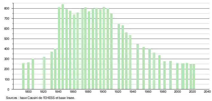 L'évolution du nombre d'habitants est connue à travers les recensements de la population effectués dans la commune depuis 1793. Pour les communes de moins de 10 000 habitants, une enquête de recensement portant sur toute la population est réalisée tous les cinq ans, les populations légales des années intermédiaires étant quant à elles estimées par interpolation ou extrapolation[19]. Pour la commune, le premier recensement exhaustif entrant dans le cadre du nouveau dispositif a été réalisé en 2007[20].