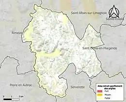 Le retrait-gonflement des sols argileux est susceptible d'engendrer des dommages importants aux bâtiments en cas d’alternance de périodes de sécheresse et de pluie. Aucune partie du territoire de la commune n'est en aléa moyen ou fort (15,8 % au niveau départemental et 48,5 % au niveau national). Sur les 196 bâtiments dénombrés sur la commune en 2019, aucun n'est en aléa moyen ou fort, à comparer aux 14 % au niveau départemental et 54 % au niveau national. Une cartographie de l'exposition du territoire national au retrait gonflement des sols argileux est disponible sur le site du BRGM[20],[Carte 2].