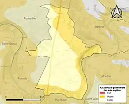 Le retrait-gonflement des sols argileux est susceptible d'engendrer des dommages importants aux bâtiments en cas d’alternance de périodes de sécheresse et de pluie. 44,7 % de la superficie communale est en aléa moyen ou fort (67,4 % au niveau départemental et 48,5 % au niveau national). Sur les 221 bâtiments dénombrés sur la commune en 2019, 97 sont en aléa moyen ou fort, soit 44 %, à comparer aux 81 % au niveau départemental et 54 % au niveau national. Une cartographie de l'exposition du territoire national au retrait gonflement des sols argileux est disponible sur le site du BRGM[21],[Carte 3].