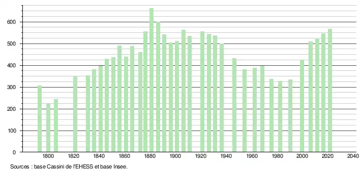 L'évolution du nombre d'habitants est connue à travers les recensements de la population effectués dans la commune depuis 1793. Pour les communes de moins de 10 000 habitants, une enquête de recensement portant sur toute la population est réalisée tous les cinq ans, les populations légales des années intermédiaires étant quant à elles estimées par interpolation ou extrapolation[31]. Pour la commune, le premier recensement exhaustif entrant dans le cadre du nouveau dispositif a été réalisé en 2006[32].