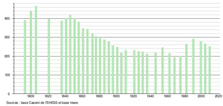 - Dans le tableau des recensements et le graphique, par convention dans Wikipédia, le principe a été retenu, pour les populations légales postérieures à 1999 de n’afficher dans le tableau des recensements et le graphique que les populations correspondant à l'année 2006, première population légale publiée calculée conformément aux concepts définis dans le décret no 2003-485 du 5 juin 2003, et les années correspondant à une enquête exhaustive de recensement pour les communes de moins de 10 000 habitants, ainsi que la dernière population légale publiée par l’Insee.