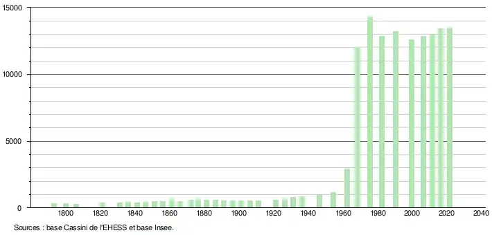 - Par convention dans Wikipédia, le principe a été retenu de n’afficher dans le tableau des recensements et le graphique, pour les populations légales postérieures à 1999, que les populations correspondant à une enquête exhaustive de recensement pour les communes de moins de 10 000 habitants, et que les populations des années 2006, 2011, 2016, etc. pour les communes de plus de 10 000 habitants, ainsi que la dernière population légale publiée par l’Insee pour l'ensemble des communes.