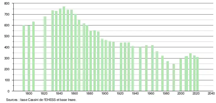 L'évolution du nombre d'habitants est connue à travers les recensements de la population effectués dans la commune depuis 1793. Pour les communes de moins de 10 000 habitants, une enquête de recensement portant sur toute la population est réalisée tous les cinq ans, les populations légales des années intermédiaires étant quant à elles estimées par interpolation ou extrapolation[16]. Pour la commune, le premier recensement exhaustif entrant dans le cadre du nouveau dispositif a été réalisé en 2007[17].
