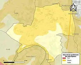 Le retrait-gonflement des sols argileux est susceptible d'engendrer des dommages importants aux bâtiments en cas d’alternance de périodes de sécheresse et de pluie. 70,7 % de la superficie communale est en aléa moyen ou fort (67,4 % au niveau départemental et 48,5 % au niveau national). Sur les 206 bâtiments dénombrés sur la commune en 2019, 189 sont en aléa moyen ou fort, soit 92 %, à comparer aux 81 % au niveau départemental et 54 % au niveau national. Une cartographie de l'exposition du territoire national au retrait gonflement des sols argileux est disponible sur le site du BRGM[21],[Carte 3].