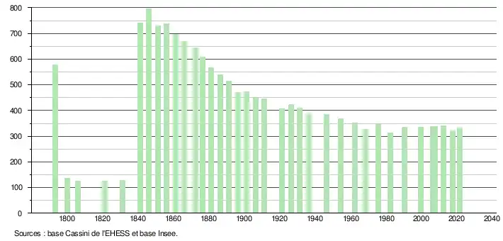 L'évolution du nombre d'habitants est connue à travers les recensements de la population effectués dans la commune depuis 1793. Pour les communes de moins de 10 000 habitants, une enquête de recensement portant sur toute la population est réalisée tous les cinq ans, les populations légales des années intermédiaires étant quant à elles estimées par interpolation ou extrapolation[31]. Pour la commune, le premier recensement exhaustif entrant dans le cadre du nouveau dispositif a été réalisé en 2007[32].