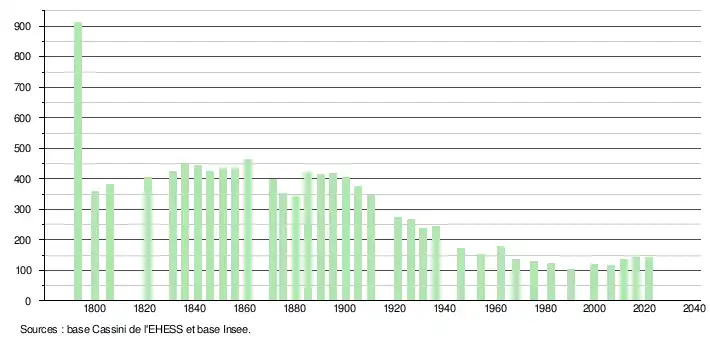 L'évolution du nombre d'habitants est connue à travers les recensements de la population effectués dans la commune depuis 1793. Pour les communes de moins de 10 000 habitants, une enquête de recensement portant sur toute la population est réalisée tous les cinq ans, les populations légales des années intermédiaires étant quant à elles estimées par interpolation ou extrapolation[15]. Pour la commune, le premier recensement exhaustif entrant dans le cadre du nouveau dispositif a été réalisé en 2006[16].