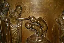 La scène principale est le baptême du Christ. Saint Jean-Baptiste est vêtu d'une mélotte, le vêtement des ermites du désert ; il fait preuve de beaucoup de respect et d'humilité face au Christ.