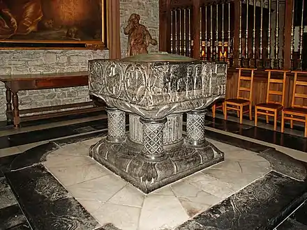 Ces fonts baptismaux romans en pierre de Tournai datent du XIe siècle[2],[3],[4],[5].