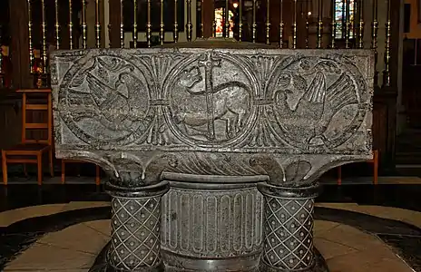 La troisième face représente l'Agneau de Dieu portant une croix entre deux colombes qui becquètent dans des grappes de raisin[11],[12].
