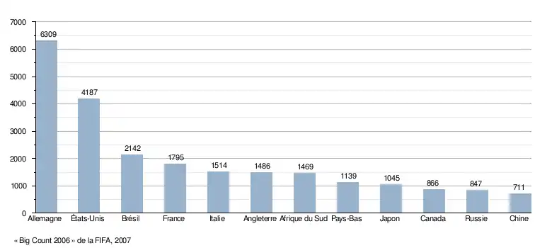 Selon un comptage publié par la FIFA le [1], le football est pratiqué dans le monde par 270 millions de personnes dont 264,5 millions de joueurs (239,5 millions d'hommes et 26 millions de femmes). On compte environ 301 000 clubs pour 1 700 000 équipes et 840 000 arbitres. 113 000 joueurs évoluent sous statut professionnel. Ce dernier chiffre est à manier avec précaution car il existe des différences considérables entre les nations à propos de la définition d'un joueur professionnel. L'Allemagne est ainsi absente du classement des vingt premières nations à ce niveau tandis que d'autres nations, moins strictes dans la définition du statut professionnel, avancent des données artificiellement élevées.