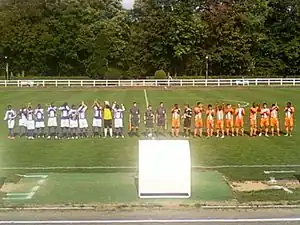 Le FC Les Lilas (à gauche en blanc et violet) qui s'apprête à jouer contre l'AC Boulogne-Billancourt le au Complexe sportif Marcel Bec à Meudon.