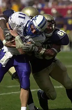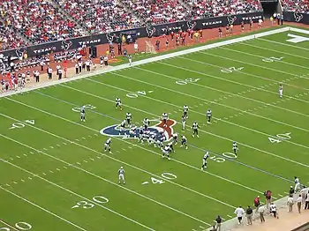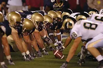 - de cinq hommes de ligne offensive - offensive linemen (OL). Ce sont des travailleurs de l'ombre imposants qui protègent le quarterback des défenseurs qui pourraient le menacer et qui ouvrent des brèches dans la défense pour les porteurs de ballon. L'un d'entre eux, le centre, a pour fonction supplémentaire de transmettre le ballon au quarterback au début de chaque phase de jeu - on parle de snap. La ligne offensive est assujettie à des règles particulières qui restreignent leur placement, leur numérotation, ainsi que la possibilité pour eux de réceptionner une passe avant. Il leur est interdit de recevoir le ballon. Ce sont des joueurs capitaux pour le bon fonctionnement d'une attaque, mais ils sont généralement méconnus du public. Cette ligne est composée du centre, des offensive tackles et des offensive guards.
