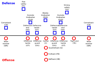 - de porteurs de ballon - running backs : rapides et puissants, leur but est de franchir le rideau défensif adverse. Il existe deux postes de running backs : le demi-arrière nommé halfback (HB), très rapide, et le fullback (FB) plus puissant mais moins rapide en règle générale que le halfback, il est également utilisé comme nettoyeur de la défense devant le halfback.