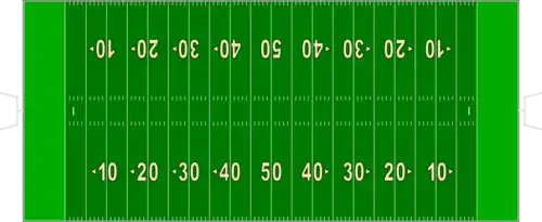 Le terrain est divisé en portions de 5 yards (4,6 m) représentées par des traits de peintures blanches pour mieux visualiser les distances parcourues. Tous les 10 yards (9,1 m), et jusqu'au centre du terrain, la distance séparant la ligne de l'en-but est marquée en police blanche.