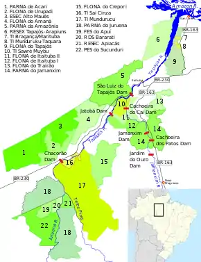 La forêt se trouve dans une région qui contient 12 zones de conservation à usage durable et 6 zones entièrement protégées. Les zones entièrement protégées, qui couvrent 6 670 422 d'hectares, sont les parcs nationaux Amazônia, Jamanxim, Rio Novo et Serra do Pardo, la réserve biologique Nascentes da Serra do Cachimbo et la station écologique Terra do Meio[5]. Les zones d'utilisation durable comprennent la zone de protection de l'environnement de Tapajós et les forêts nationales d'Altamira, Amaná, Jamanxim, Trairão, Itaituba I, Itaituba II et Tapajós, couvrant un total de 7 555 889 d'hectares[5].
