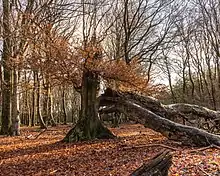 Chêne brisé dans les forêts royales de Loo. Il n'y a pas d'interventions humaines dans cette partie des forêts, et ce processus est entièrement naturel. Décembre 2020.