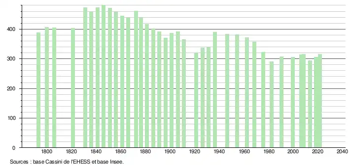 L'évolution du nombre d'habitants est connue à travers les recensements de la population effectués dans la commune depuis 1793. Pour les communes de moins de 10 000 habitants, une enquête de recensement portant sur toute la population est réalisée tous les cinq ans, les populations légales des années intermédiaires étant quant à elles estimées par interpolation ou extrapolation[27]. Pour la commune, le premier recensement exhaustif entrant dans le cadre du nouveau dispositif a été réalisé en 2008[28].