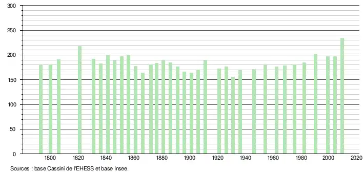 L'évolution du nombre d'habitants est connue à travers les recensements de la population effectués dans la commune depuis 1793. À partir du , les populations légales des communes sont publiées annuellement dans le cadre d'un recensement qui repose désormais sur une collecte d'information annuelle, concernant successivement tous les territoires communaux au cours d'une période de cinq ans. Pour les communes de moins de 10 000 habitants, une enquête de recensement portant sur toute la population est réalisée tous les cinq ans, les populations légales des années intermédiaires étant quant à elles estimées par interpolation ou extrapolation[7]. Pour la commune, le premier recensement exhaustif entrant dans le cadre du nouveau dispositif a été réalisé en 2004[8],[Note 1].