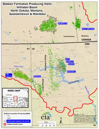 L'usage de la fracturation hydraulique (à partir de 2008) a provoqué un boom d'exploitation de la formation de Bakken. À la fin de 2010, le volume de pétrole extrait a atteint 458 000 bbl par jour (72 800 m3/j), quantité qui excède largement les capacités de transport des oléoducs localement disponibles[10],[11], le pétrole étant alors transporté par train et camion. En 2013, la production est de 780 000 bbl par jour et pourrait atteindre 1 600 000 bbl en 2020[12].