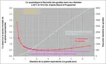 - Les mêmes auteurs notent qu'entre les Reynolds 750 et 350 000 le de sphères rigides se montre à peu près constant et égal à mais cette plage de Reynolds est justement celle où les gouttes perdent progressivement leur forme sphérique (ce que l'on observe ci-contre à gauche sur le graphe du de la sphère en fonction du diamètre au fait que la courbe du diverge de la courbe fuchsia réservée aux sphères lisses).