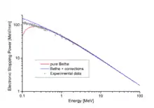 Dans l'image ci-contre, les petits cercles sont des résultats expérimentaux obtenus par des auteurs variés (prises de http://www.exphys.jku.at/Stopping/) ; la courbe est la formule de Bethe. Il est évident que la formule de Bethe est en excellent accord avec les expériences à hautes énergies, notamment si les corrections (voir plus bas) sont ajoutées.
