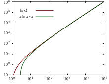 Dans le cadre de la thermodynamique statistique (distribution de Boltzmann) il est commode de considérer le logarithme népérien d'une factorielle en faisant l'approximation de Stirling[9]. L'approximation consiste à assimiler la somme à une intégrale quand n est suffisamment grand[10].