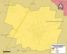 Les mouvements de terrains susceptibles de se produire sur la commune sont des tassements différentiels[17]. Le retrait-gonflement des sols argileux est susceptible d'engendrer des dommages importants aux bâtiments en cas d’alternance de périodes de sécheresse et de pluie[18]. La totalité de la commune est en aléa moyen ou fort (54,9 % au niveau départemental et 48,5 % au niveau national)[Carte 2]. Depuis le , en application de la loi ELAN, différentes contraintes s'imposent aux vendeurs, maîtres d'ouvrages ou constructeurs de biens situés dans une zone classée en aléa moyen ou fort[Note 3],[19].