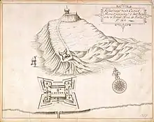 Le modeste Fort Belgica du début au sommet d'une colline, dominant le Fort Nassau en contrebas.